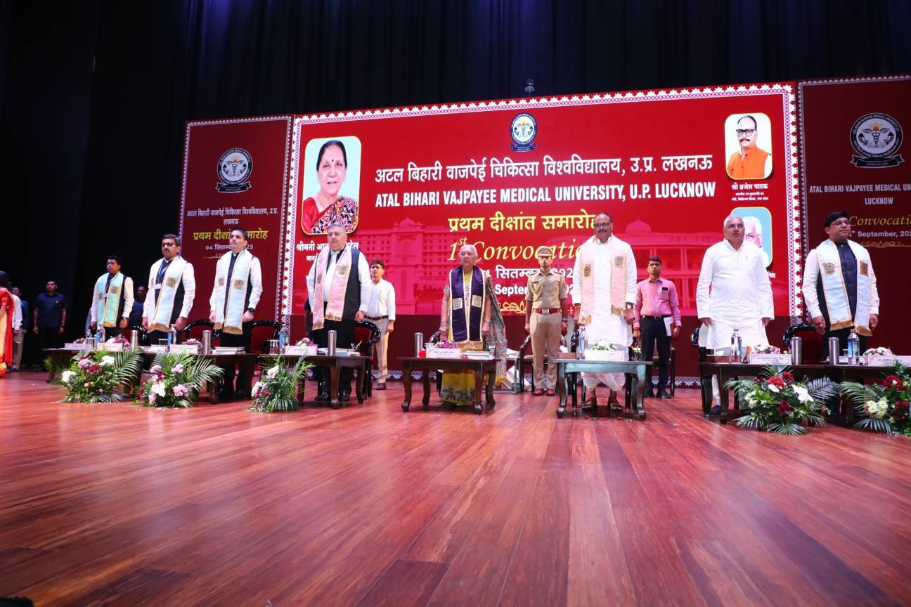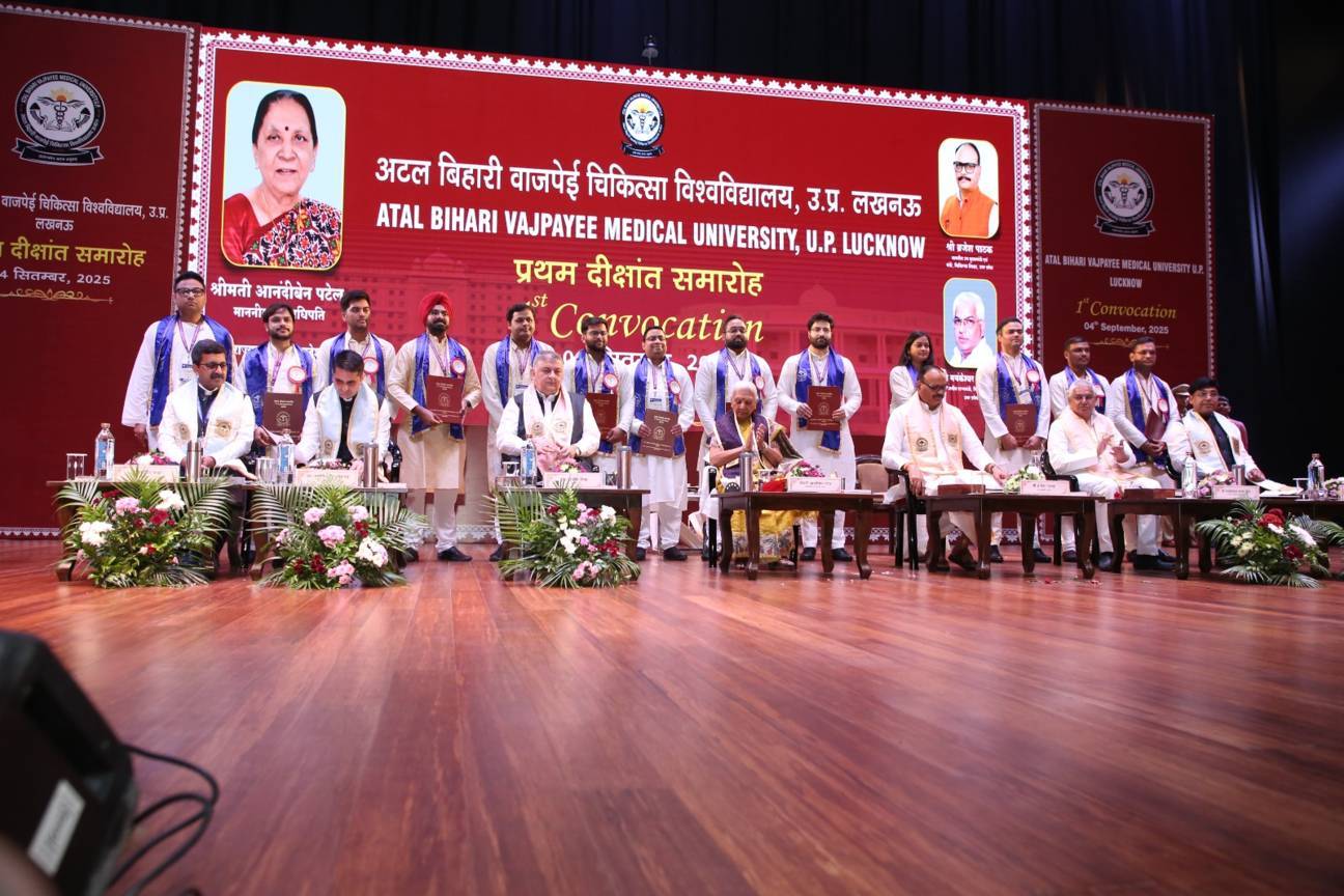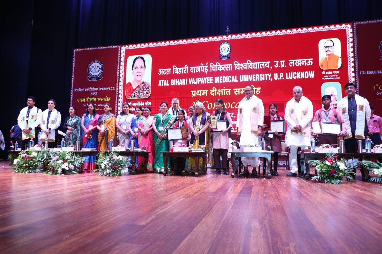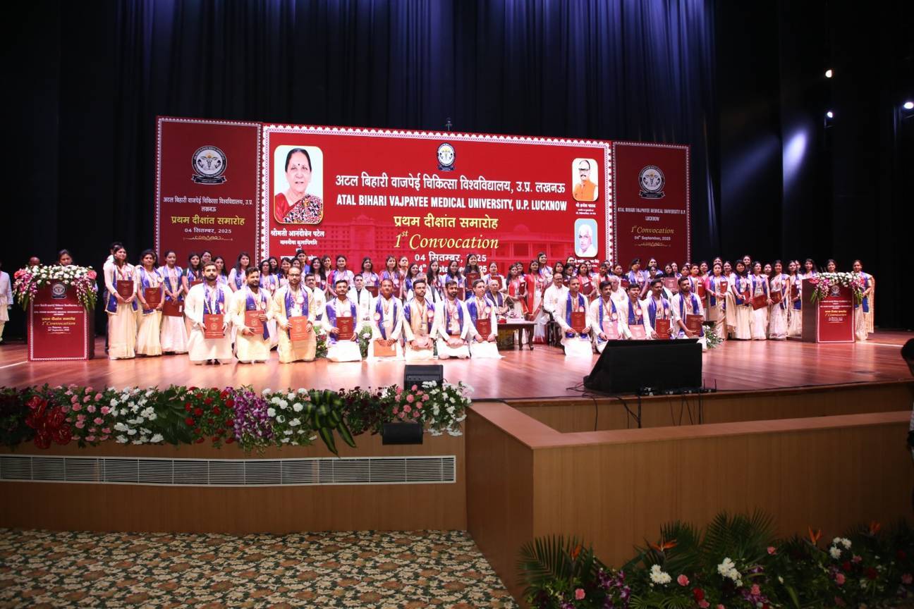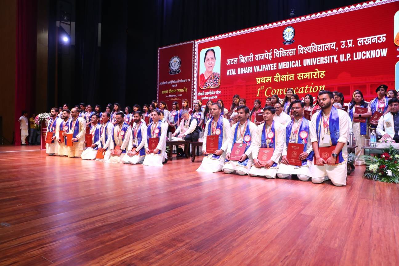 1st Convocation of Atal Bihari Medical University, UP, Lucknow, was held on 4th September, 2025 at the auditorium of University. The convocation was presided over and blessed by Hon'ble Chancellor and Governor of Uttar Pradesh, Smt. Anandiben Patel ji. Hon'ble Deputy Chief Minister and cabinet minister Medical Education Sri. Brajesh Pathak ji, was Chief Guest and State Minister, Medical Education Sri Mayankeshwar Sharan Singh was the Guest of Honour. 74 Gold and Silver medals and 8526 degrees were awarded to students of Nursing, Dental, Medical and Paramedical disciplines at the convocation.