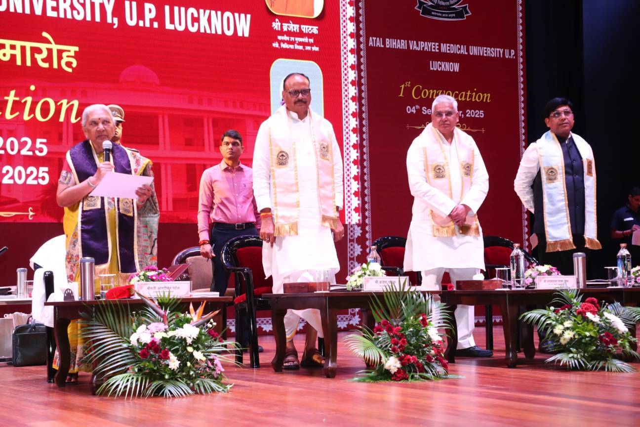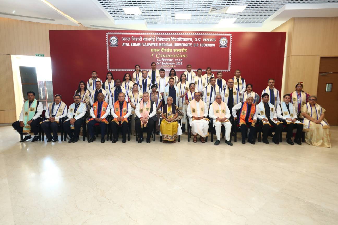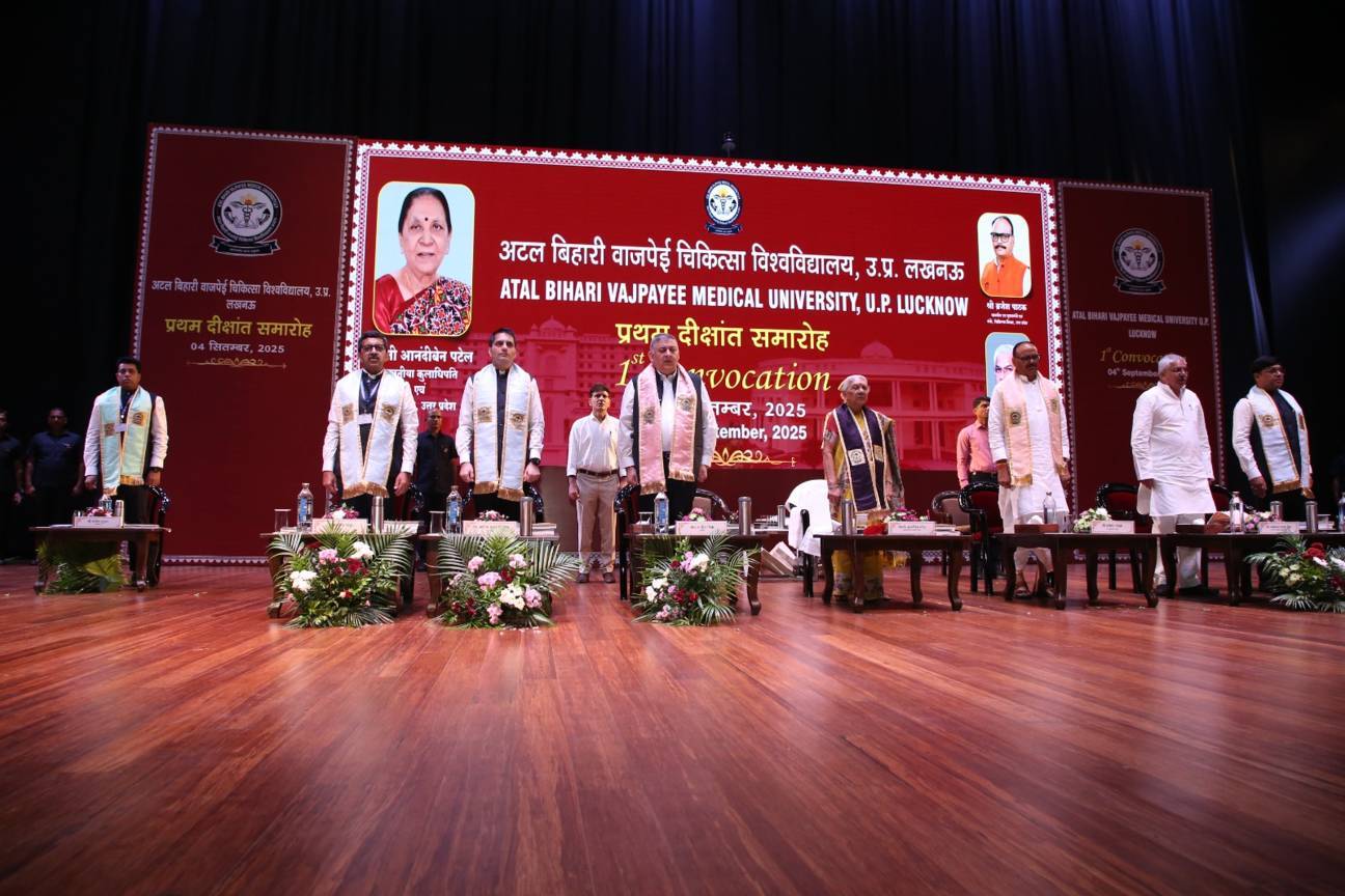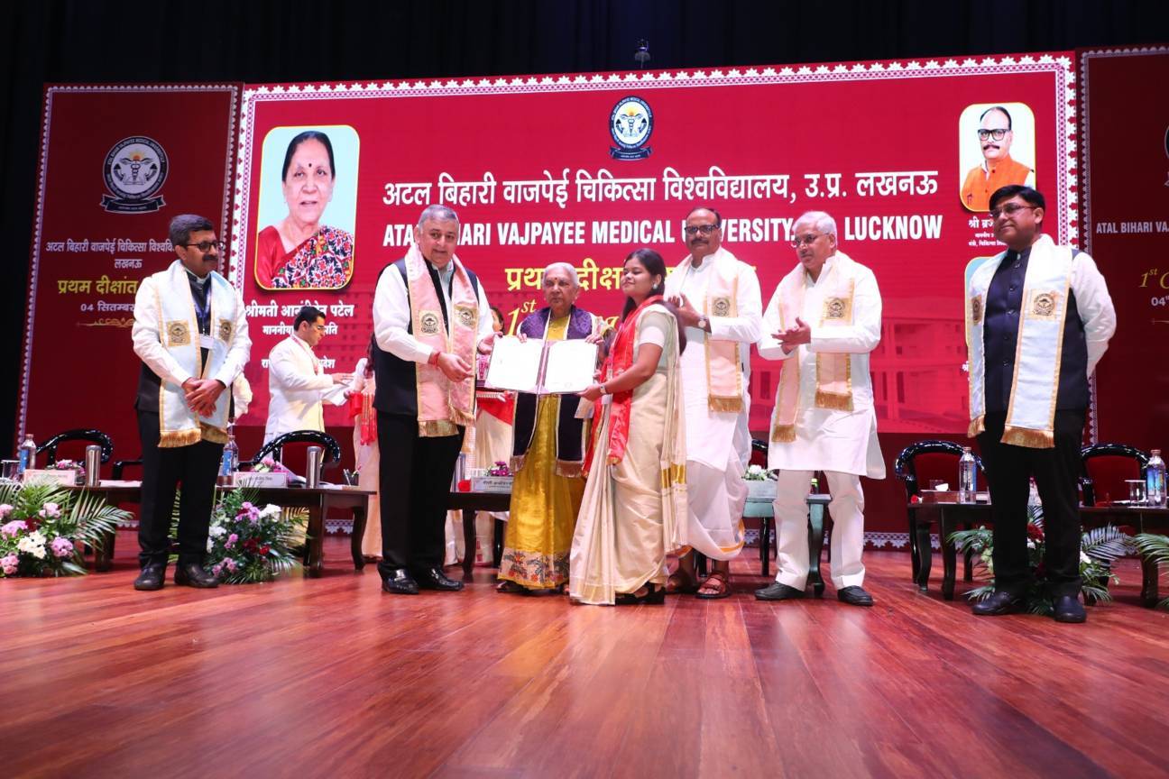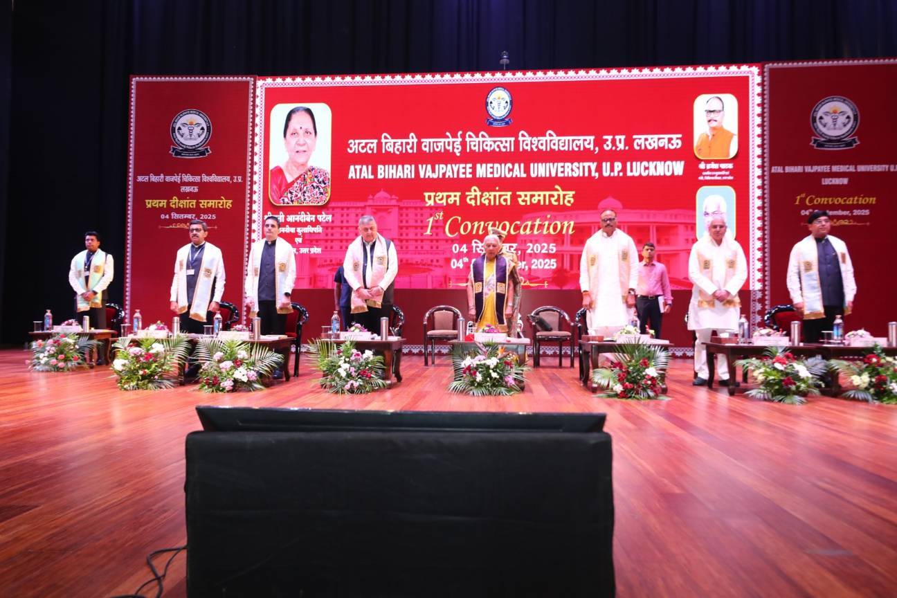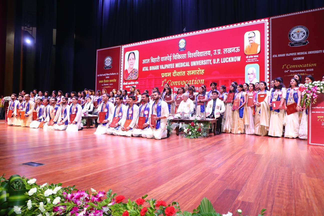 1st Convocation of Atal Bihari Medical University, UP, Lucknow, was held on 4th September, 2025 at the auditorium of University. The convocation was presided over and blessed by Hon'ble Chancellor and Governor of Uttar Pradesh, Smt. Anandiben Patel ji. Hon'ble Deputy Chief Minister and cabinet minister Medical Education Sri. Brajesh Pathak ji, was Chief Guest and State Minister, Medical Education Sri Mayankeshwar Sharan Singh was the Guest of Honour. 74 Gold and Silver medals and 8526 degrees were awarded to students of Nursing, Dental, Medical and Paramedical disciplines at the convocation.