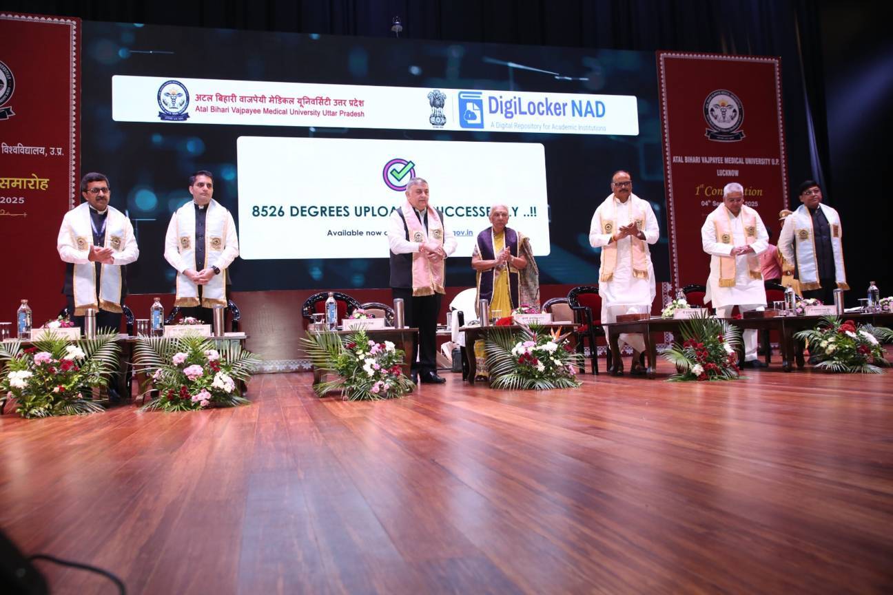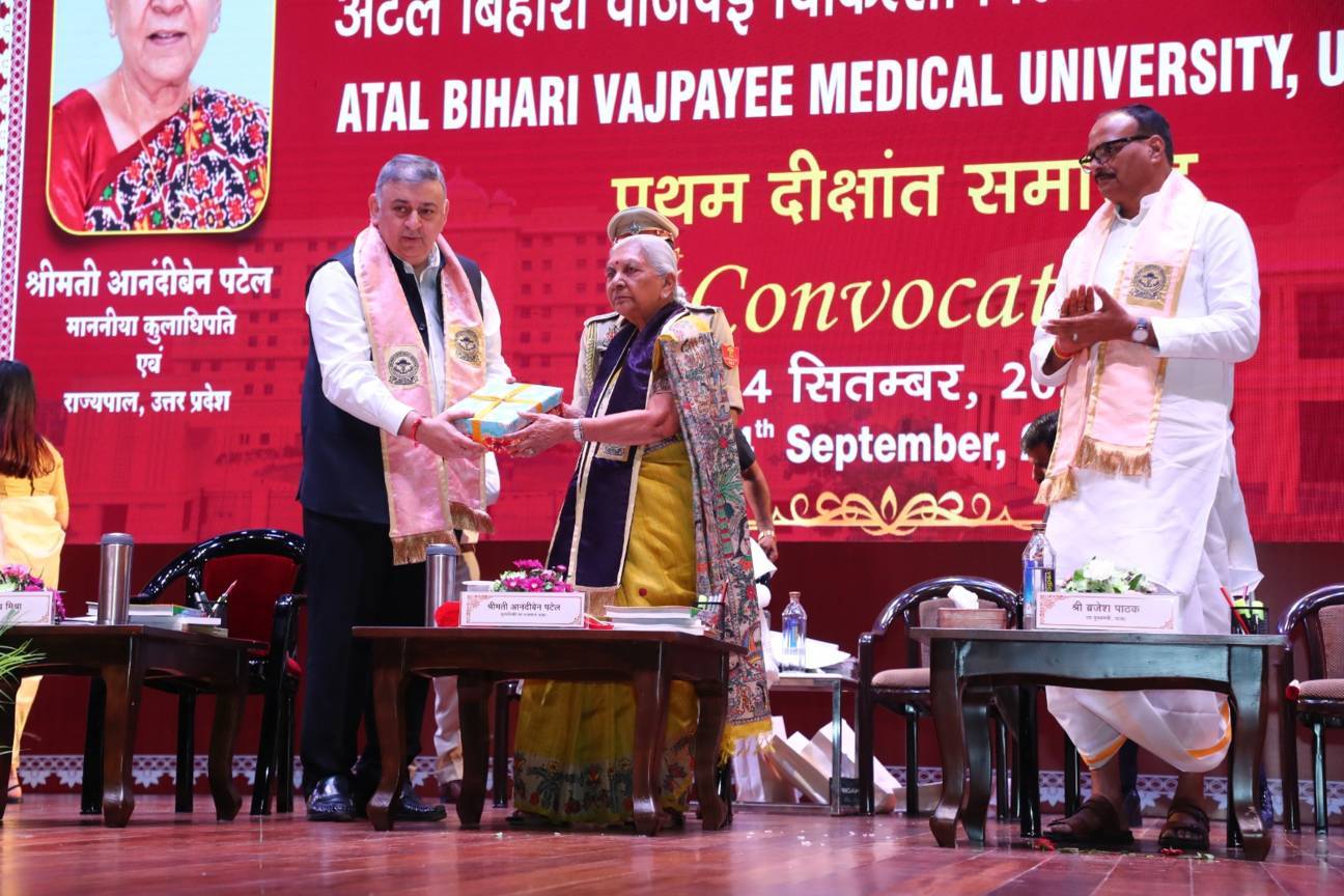 1st Convocation of Atal Bihari Medical University, UP, Lucknow, was held on 4th September, 2025 at the auditorium of University. The convocation was presided over and blessed by Hon'ble Chancellor and Governor of Uttar Pradesh, Smt. Anandiben Patel ji. Hon'ble Deputy Chief Minister and cabinet minister Medical Education Sri. Brajesh Pathak ji, was Chief Guest and State Minister, Medical Education Sri Mayankeshwar Sharan Singh was the Guest of Honour. 74 Gold and Silver medals and 8526 degrees were awarded to students of Nursing, Dental, Medical and Paramedical disciplines at the convocation.